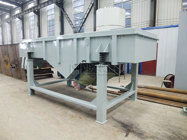 直線振動篩利用振動電機激振作為振動源,使物料在篩網上被拋起,同時向前作直線運動,物料從給料機均勻地進入篩分機的進料口,通過多層篩網產生數種規格的篩上物、篩下物、分別從各自的出口排出。